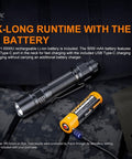 At just 5.5 inches and pocket-clip enabled, the Fenix PD36 TAC flashlight offers amazing power and performance in a portable package. Impressive 3000 lumens of light and 898 feet of beam distance powered by a single Fenix ARB-L21-5000U USB Type-C rechargeable battery let you take on the night. Fast recharge in 4 hours and with a maximum run time of 160 hours on eco mode, this light is engineered for the long haul. Constructed from impact-resistant A6061-T6 aluminum alloy with double springs for battery protection, this EDC and tactical powerhouse stands up to any task. Expedite your mission with a tactical switch, mechanical toggle switch and two user-friendly operation modes. Get the dependable, dynamic lighting you need - go with the Fenix PD36 TAC flashlight.