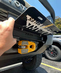 This is a front license plate bracket that mounts directly to a Hawse style fairlead. Simply use the flip up hinge when accessing your winch, and flip down when driving on the road to stay legal.