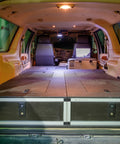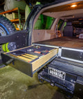 The Ford Excursion Single Drawer Module contains both a drawer in the rear half section as well as a storage compartment behind the drawer that is accessible from a top access hatch. NOTE: This is only one drawer module, you can fit two units side x side in the rear of your Excursion in the Third Row Seating location, this module does not affect the second row seating.