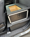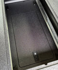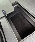 The top plate of this drawer is equipped with an access door in the top allowing you to open the drawer, remove the top access hatch and then get into the factory storage compartment that was below the second row seat.