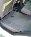 The 40% Seat Delete Plate System is a bolt-in replacement for the driver’s second row seat. This Seat Delete measures 21-5/8” wide x 29-¾" long. The access hatch is a 11 ½” across by 15” front to back locking storage access door that provides access to an under-platform storage area that is approximately 6” high. The approximate weight for the Seat Delete is abound 18.6lbs..