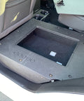 The 60% Seat Delete Plate System is a bolt-in replacement for the passenger second row seat. This Seat Delete measures 32-1/2” wide x 29-3/4” long. The access hatch is a 20 ½” across by 13” front to back locking storage access door that provides access to an under-platform storage area that is approximately 6” high. The approximate weight for the Seat Delete is abound 20lbs..