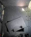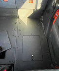 Both platforms feature front vertical enclosure and exterior facing infill side panel enclosures. This Plate System is designed and built with industrial grade plywood and coating using our propriety spray methods for superior durability and wear resistance. All necessary hardware to bolt the Seat Deletes into the vehicle using factory anchor points are included.