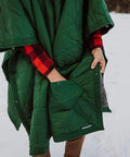 Snaps along the edge of the Mountain Blanket helps it to easily transform into different modes. From classic camp blanket, for laying out on the ground, to a minimalist sleeping bag for unexpected overnight excursions. A center opening in the blanket turns it into a stylish, yet functional poncho, a wearable blanket for staying warm and dry, while keeping your hands free. Flip the plush fleece-lined stuff sack inside out, and stuff it for a backup pillow.