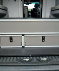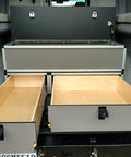 The system is available in two lengths: Short and Long. The short system allows for a flat area of approximately 11" behind the drawers just in front of the rear cargo doors. The long system runs from the bulkhead behind the shower and all the way to the rear cargo doors. The image shown below is a picture of a top system installed onto a base drawer system.