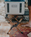 This Cooler Stand provides a sturdy, no-slip surface for your camp stove, cooler or grill. After use, the stand can be unlocked and folded up nicely for storage in the included carry bag. Aluminum legs feature a wood print.