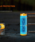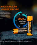 The Fenix ARB-L21-6000 21700 rechargeable Li-ion battery has a capacity of 6000mAh, providing the necessary voltage and power for long-lasting use and increased lumen capabilities. With the same features as other high-quality Fenix batteries, such as internal protective circuits and up to 500 charging cycles, the ARB-L21-6000 can ensure extended runtime and consistent performance. It also offers three sets of overheat protection - pressure relief, microporous, and PTC cathodal block - to maintain the battery's safety and stability. Never be without light; order a spare 21700 battery today.