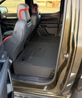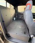 The Ford Ranger second row seat deletes are designed for you to easily remove your rear seats and create a flat and secure platform for gear storage. The platform includes hatches that allow access to the factory storage space below the rear seats. In addition to the seat platform, you also get a back wall replacement that is secured to the platform, and the factory anchor points in the back wall.