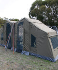 The Awning Connector is an innovation from Oztent. It allows you to zip two Oztents together, awning to awning. This is beneficial when travelling with a family as it allows you to have two separate rooms (one for the kids) with a large undercover area in between. The connector has an innovative gutter system to collect water and funnel it away from the tent.