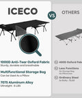 【PREMIUM FABRIC MATIRAL】ICECO camping beds are made from tear-resistant 1000D Oxford fabric. With excellent strength, easy cleaning and breathability, it will be more comfortable and durable than other camping beds.