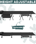 【HEIGHT ADJUSTABLE】Two height options with this folding bed, the height of high mode is 15 inches(38cm)that’s close to a normal sleeping bed which perfect to use on damp ground or as a bench. The low mode is 7.5 inches(19cm), removing cot legs which use in a tent or solid ground, especially on wilderness of sand, giving you the best outdoor sleeping experience.