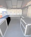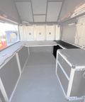 Image above reflects a Rear Double Drawer Module on the Passenger side and Utility Modules at all other locations. The benefit of this design is that you have a convenient place to store your essential cooking gear right next to the rear door. If you have added the GP Factor drop down tables to your rear door, your cooking gear is located within arms reach of the cook.