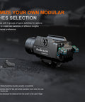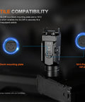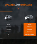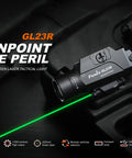 The Fenix GL23R is a powerful, compact pistol-mounted tactical light designed for optimal performance in any situation. With a 1200-lumen maximum output and a precise 520 nanometer green laser, this light ensures superior visibility and accuracy. The GL23R features modular, customizable switches with ambidextrous power and output selection, allowing seamless operation for both left- and right-handed users. Its compact and lightweight body, measuring under 4 inches and weighing just over 4 ounces, makes it an ideal fit for any firearm. Capable of illuminating targets up to 240 meters away, the GL23R also boasts a minimal laser offset of less than .8 mm for precision shooting. Built to endure, it withstands a 10,000-cycle shock test and over 5,000 rounds of simulated live fire while maintaining a 2MOA accuracy. The USB-C rechargeable light includes a Glock mounting plate and a 1913 Picatinny rail plate, ensuring compatibility with a wide range of firearms. With an impressive 13-hour green laser runtime and IP66-rated waterproofing, the GL23R is engineered to perform in even the toughest conditions.
