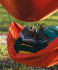The Joey Gear Sling holds 60 lb worth of gear suspended underneath your hammock, keeping your equipment off the ground all night long. No more dirt stains on your pack, or critters in your shoes. Easily access your pack through the night, and experience the wonder of camping off the ground.