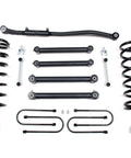 Up front the lift kit includes gas-specific Pro-Ride coil springs, heavy duty adjustable track bar, fixed length tubular upper and lower control arms, fixed length sway bar links with stud eliminator, and precision tuned NX2 or FOX 2.0 nitrogen charged shocks. In the rear this kit utilizes heavy duty cast steel blocks, longer u-bolts, and a matching set of NX2 Nitro or FOX 2.0 Performance shocks.