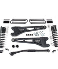 Up front the lift kit includes diesel-specific Pro-Ride coil springs, heavy duty replacement radius arms, high strength 1-3/8 inch solid steel track bar for steering correction, sway bar relocation, brake line brackets and precision tuned nitrogen charged shocks.