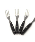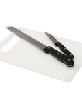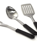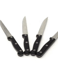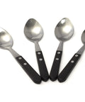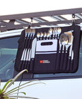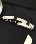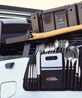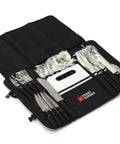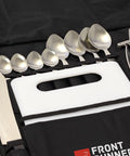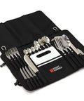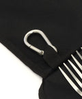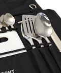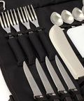 These are not your typical cheap, and easy to break, ''throw away'' camp utensils.The composite handles offer a comfortable and ''weighty'' grip.Triple riveted knife handles with double riveted fork and spoon handles.Professional forged knife blades with black comfort grip poly handles.The steak knives feature high quality, micro-serrated edges.CONTAINS:4 x serrated knifes4 x steak forks4 x dessert spoons4 x tea spoons1 x chopping board1 x paring knife1 x bread knife1 x carving knife1 x serving spoon1 x spatula1 x BBQ/Campfire fork1 x Bottle opener and corkscrewThe entire kit fits in a custom tool-style roll with flap, adjustable straps and buckles, and carrying handles. Also features loops with carabiners so the opened roll and utensils can be hung for quick and easy access. Depth: 2 in Length: 8 in Width: 17 in
