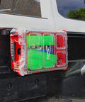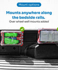 - Multiple mounting points allow it to be attached anywhere along the rail, including over the wheel wells.